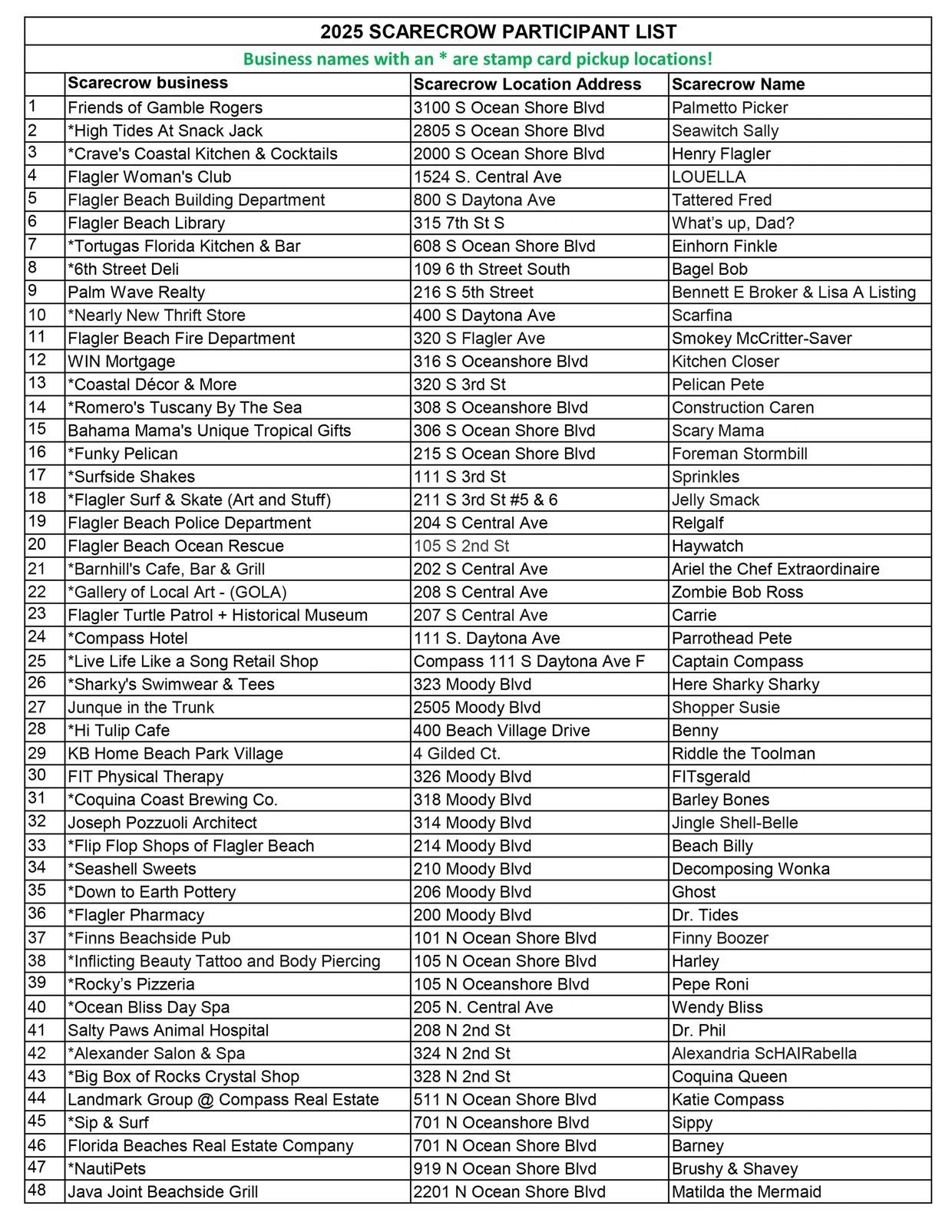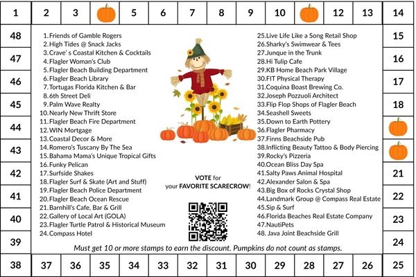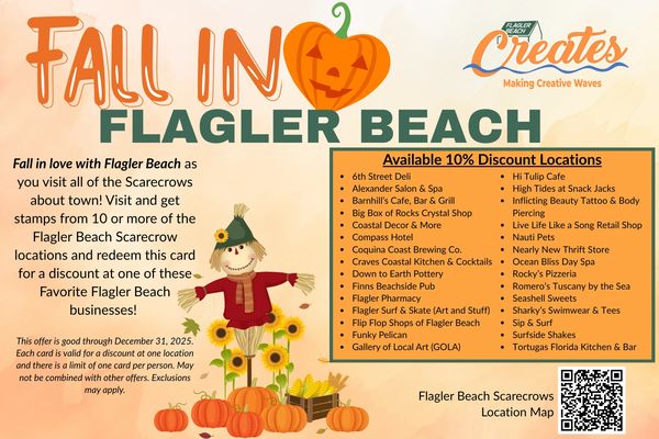 Pick up your "Fall in 🧡 Flagler Beach" stamp card at any of the locations with an (*) in front of their business name. Visit and get stamps from 10 or more scarecrow locations throughout the month. Redeem the card at one of the designated Flagler Beach businesses for a 10% discount!